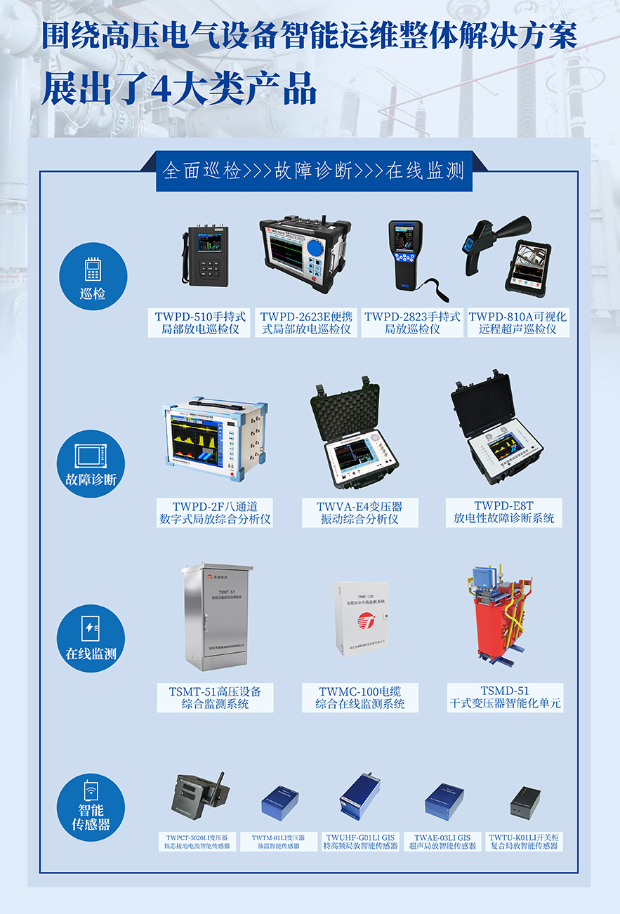 在这两场均是千人规模的专业人士大会上,我司携带展出产品阵容强大。围绕高压电气设备智能运维整体解决方案从巡检、故障诊断、在线监测三个环节展出了四大类产品。